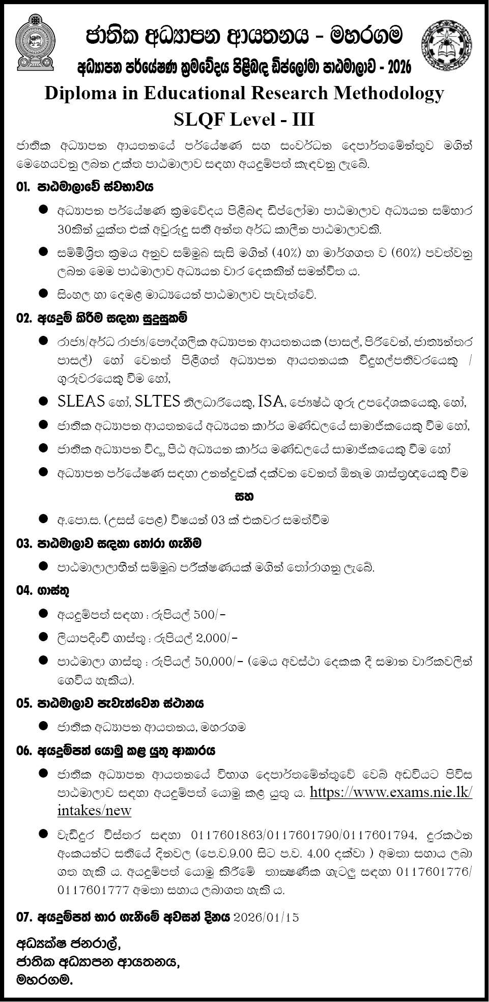 Online Apply Link: https://exams.nie.lk/intakes/new